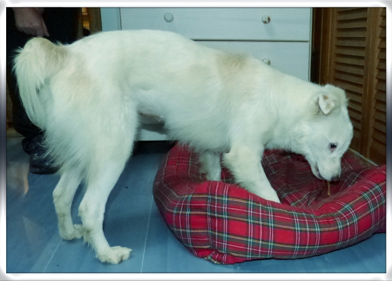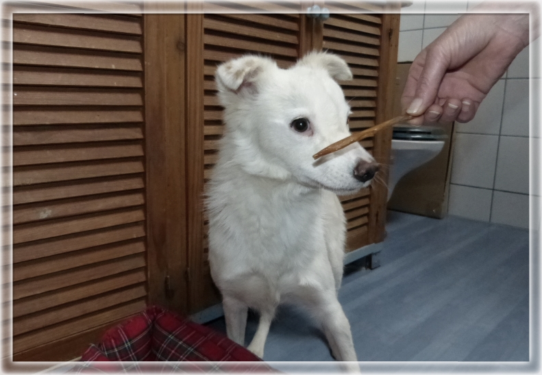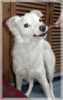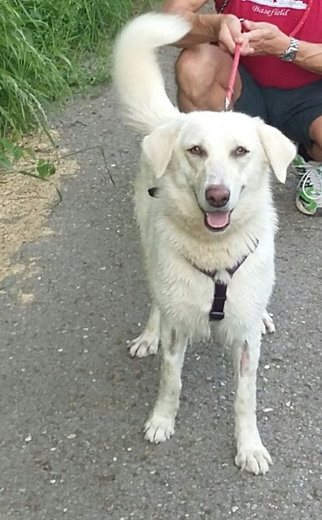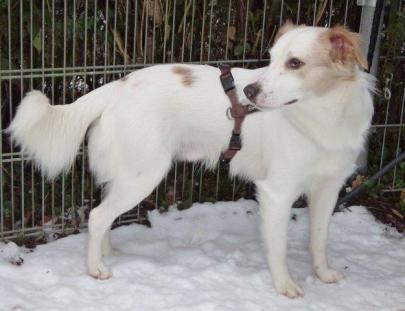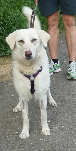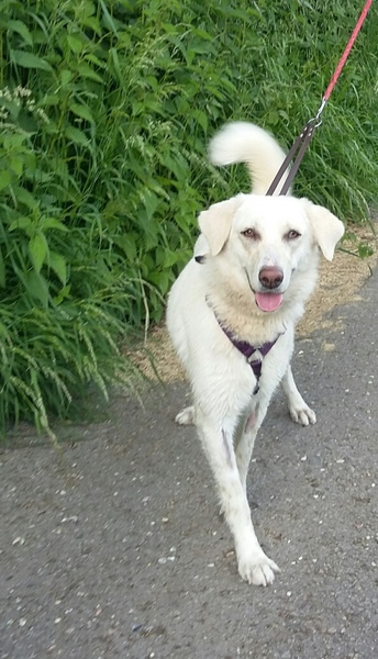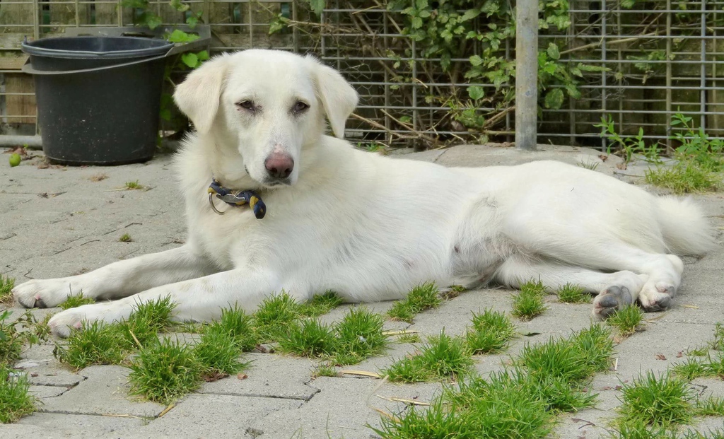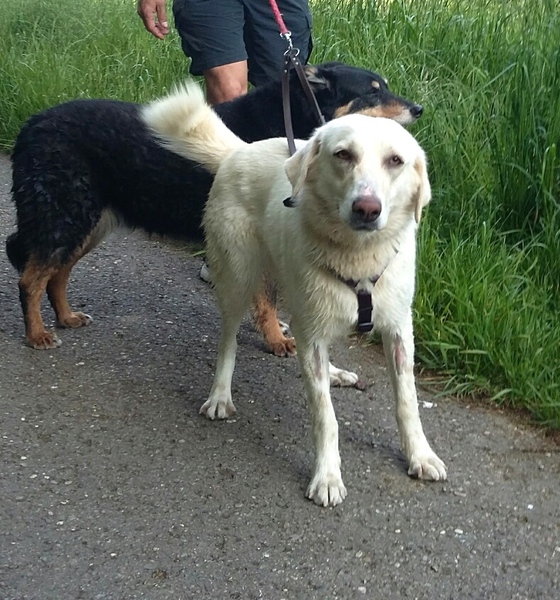 wahrscheinlich ausgelöst durch ein von Menschen zugefügtes Trauma im Welpenalter. Die mittelgroße, weiße Hündin hat sich innerhalb kurzer Zeit gut ins Rudel eingelebt, ist freundlich und