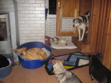 Es kam der Tag, an dem er in die Hundegruppe integriert werden sollte. Er zeigtekeine Angst vor den Hunden, und wurde von der Gruppe schnell akzeptiert. Durch die wenige Bewegung in der Hütte waren seine Glieder steif, so dass es ihm zunächst schwer fiel, sich zu bewegen. Immer suchte er sich Ecken, um sich zu verstecken, aber vom Hausaus konnte ich beobachten,wie er sich dann neugierig hervor wagte. Es gibt für mich nichts Schöneres, als zu sehen, wie eine solch geschundene Kreatur wieder Mut findet, am Leben teil zu nehmen.
